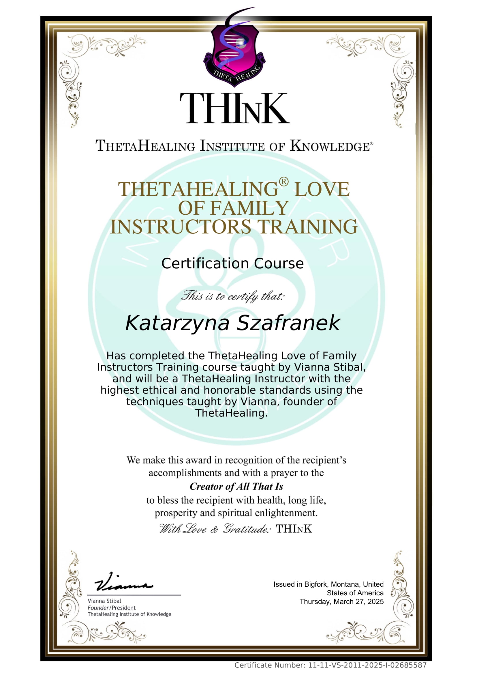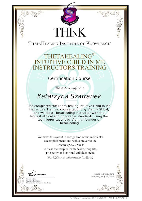 Po wieloletniej pracy terapeutycznej i nauczania tej wspaniałej metody otrzymałam tytuł mistrza potwierdzony certyfikatem.